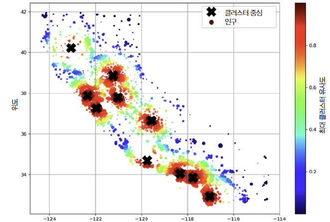 주택 가격으로 가중치를 부여하고 모든 구역에 위도와 경도로 fit_transform()을 호출한다.